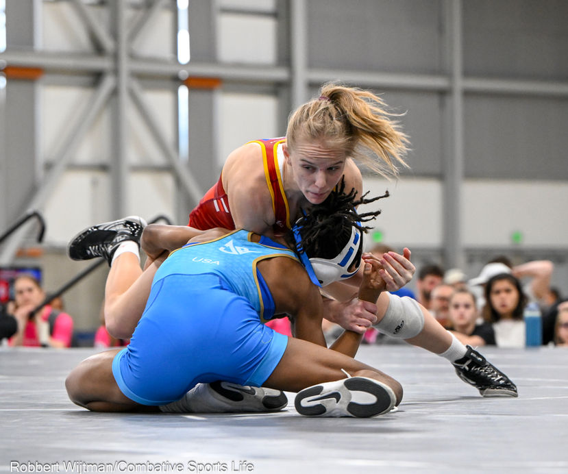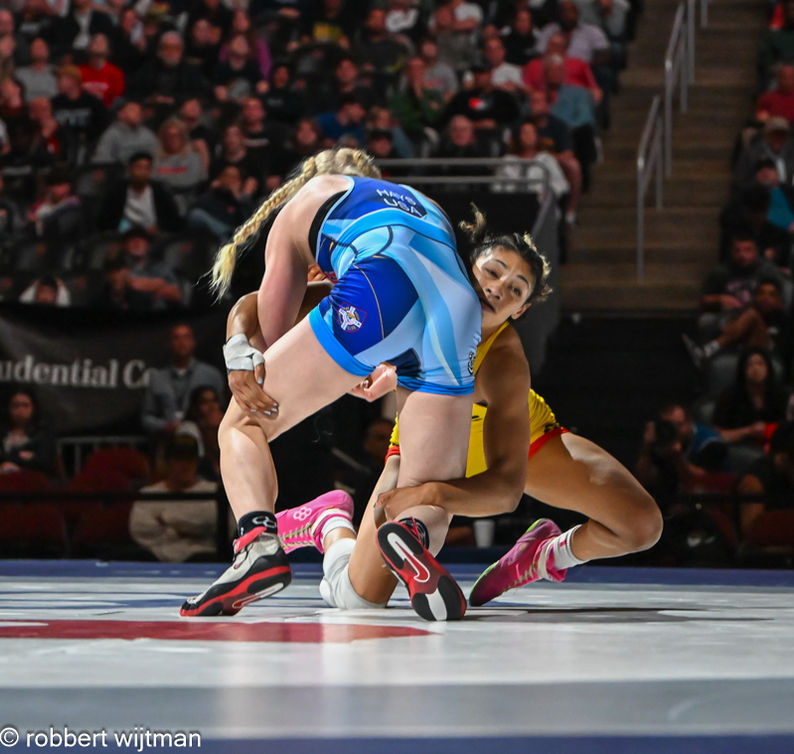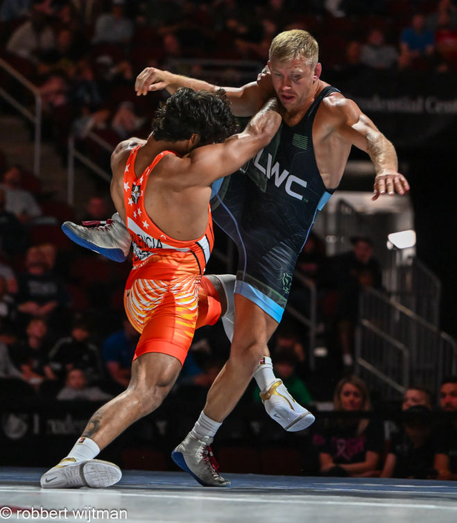 NEWARK, N.J. JUNE 14, 2025 - Wyatt Hendrickson rages in on a blast double leg take-down. The match - second in a best of three series - was part of the Final X event. Held in Newark, New Jersey, on June 14, 2025, it was the final cross between the winners of the